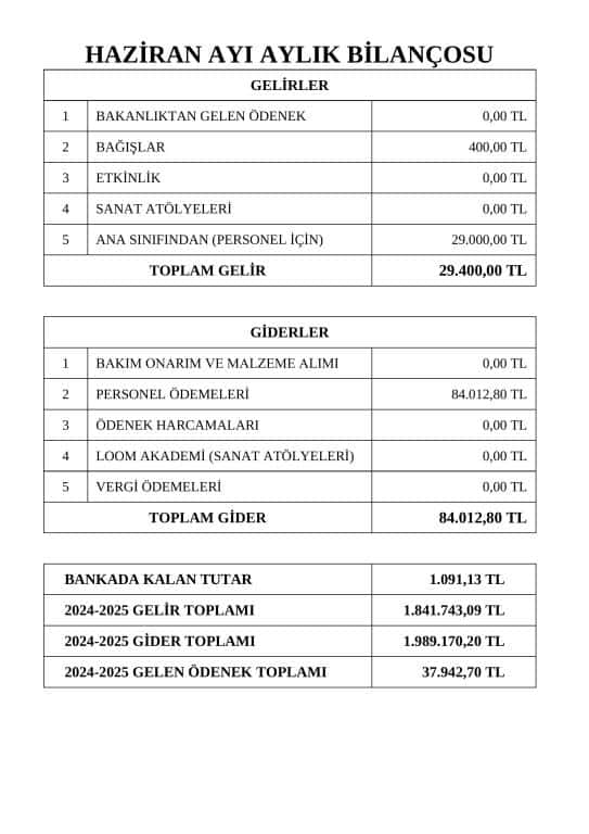 Okulumuza ait Haziran ayı bilançosu ve mevcut borç listesi aşağıdaki gibidir. Bilanço ayrıca okul aile birliği duyuru panosunda da yayınlanmıştır. Bilgilerinize sunulur.